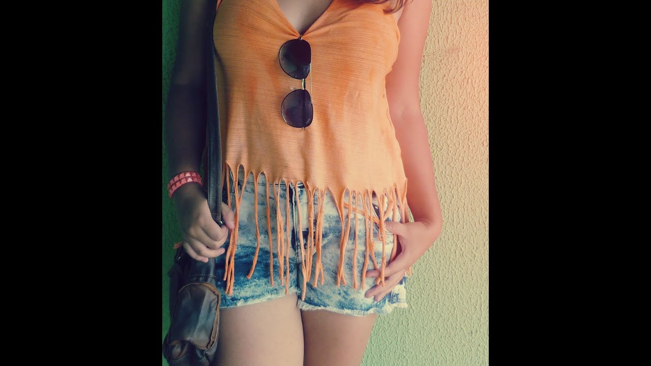Na parte de baixo da blusa comece a fazer cortes em formas de tirinhas lado a lado deixando um espaço no minimo a medida de um dedo.